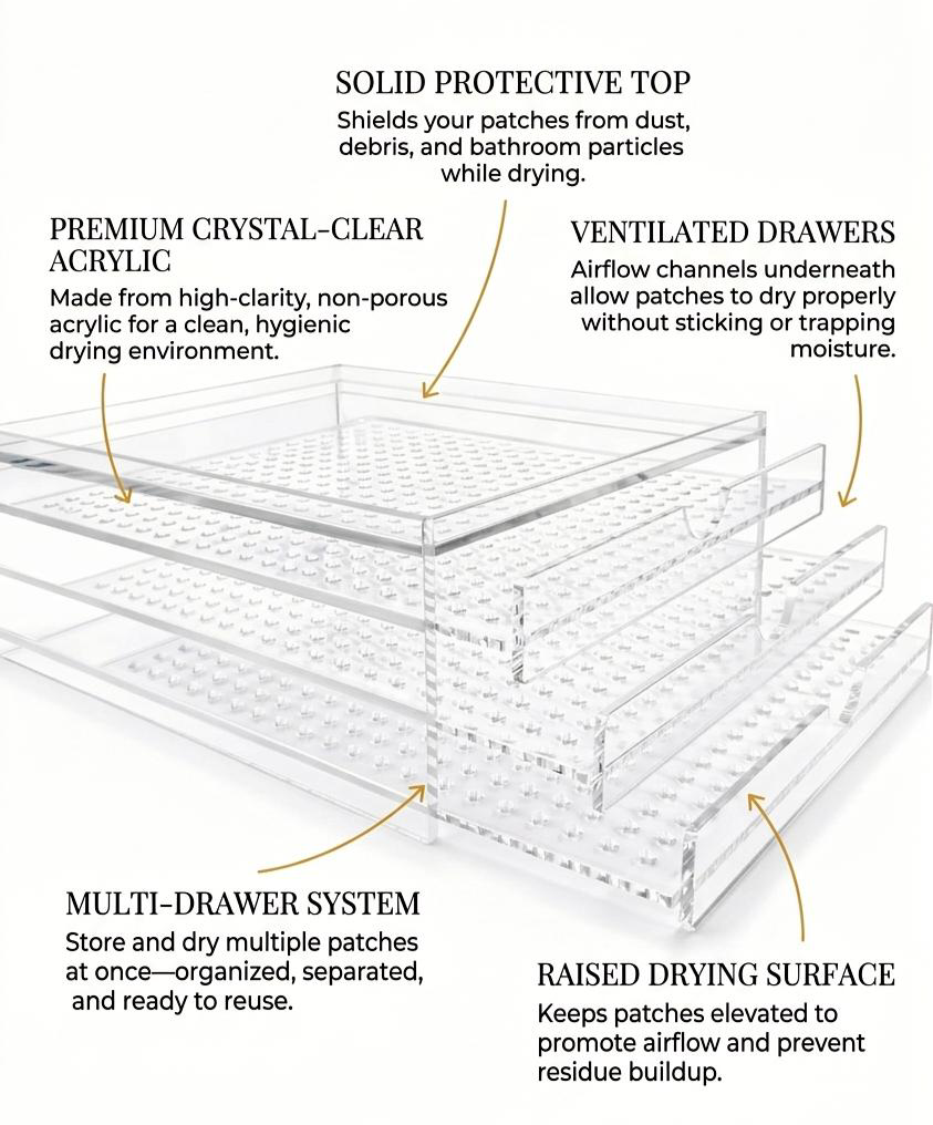 Its ventilated design allows patches to dry evenly while avoiding contact with contaminated surfaces, while the enclosed structure helps protect them from dust and everyday exposure. Once dry, patches remain stored flat and ready for consistent reuse.