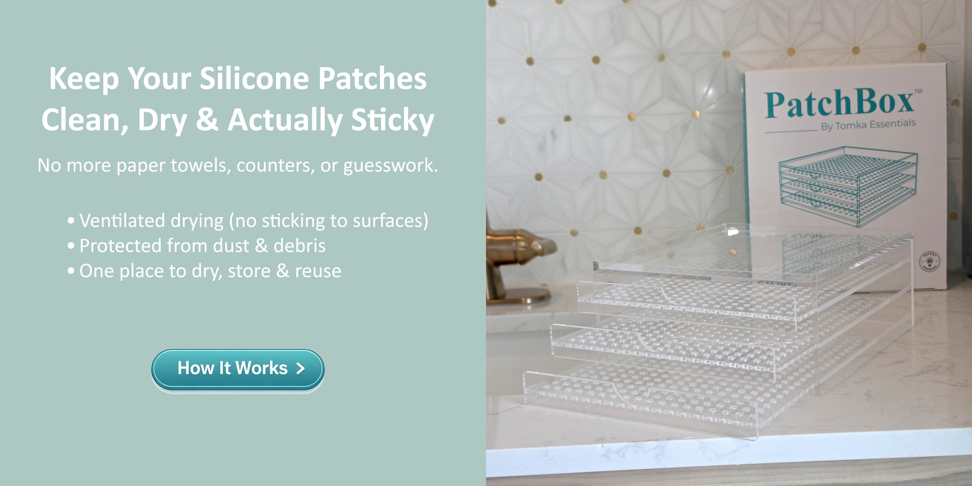 PatchBox™ introduces a new standard in patch care—a Patent Pending drying and storage system engineered to maintain the cleanliness, structure, and longevity of reusable silicone patches.